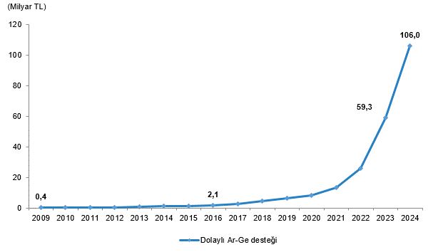 Ar-Ge faaliyetlerine yönelik toplam vergi teşviki 2023 yılında 59 milyar 332 milyon TL iken %78,6 artış göstererek 2024 yılında 105 milyar 977 milyon TL oldu.