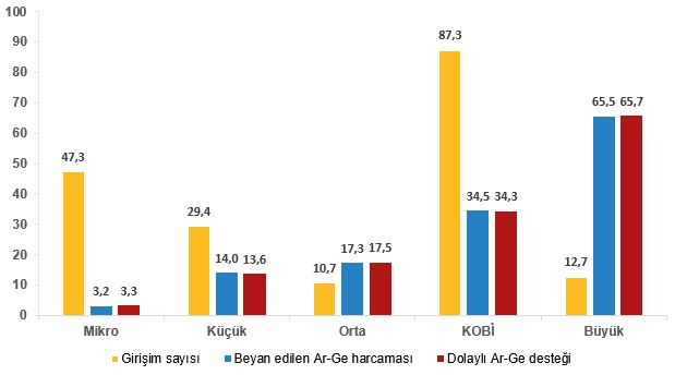Dolaylı Ar-Ge teşviklerinden yararlanan girişimler büyüklük gruplarına göre ele alındığında, 10 bin 569 girişimin %87,3'ünün küçük ve orta büyüklükteki işletmeler (KOBİ) olduğu görüldü. Girişim sayısı bakımından Ar-Ge teşviklerinden yararlanan büyük ölçekli girişimlerin payı %12,7 iken bu girişimler dolaylı Ar-Ge teşviklerinin %65,7'sinden yararlandı.
