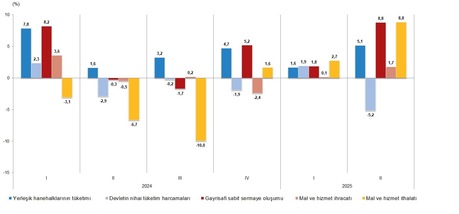 Yerleşik hanehalklarının nihai tüketim harcamaları 2025 yılının ikinci çeyreğinde bir önceki yılın aynı çeyreğine göre zincirlenmiş hacim endeksi olarak %5,1 arttı. Devletin nihai tüketim harcamaları %5,2 azalırken gayrisafi sabit sermaye oluşumu ise %8,8 arttı.