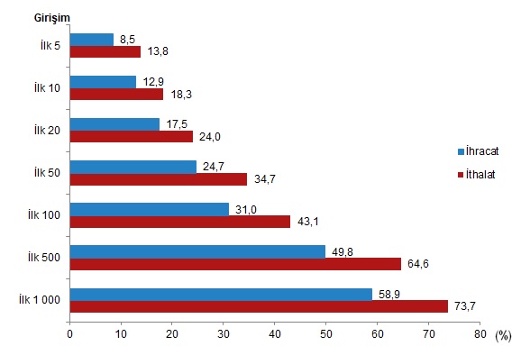 İhracatın %49,8'ini, ithalatın ise %64,6'sını ilk 500 girişim yaptı. En çok ihracat yapan ilk 5 girişim toplam ihracatın %8,5'ini, en çok ithalat yapan ilk 5 girişim ise ithalatın %13,8'ini gerçekleştirdi.