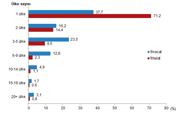 Girişimlerin %71,2'si, tek ülkeden ithalat yaparken, %14,4'ü, iki ülkeden ithalat yaptı. Yirmi ve daha fazla ülkeden ithalat yapan girişimlerin oranı %0,8 iken, bu girişimlerin ithalattaki payı %57,9 oldu.