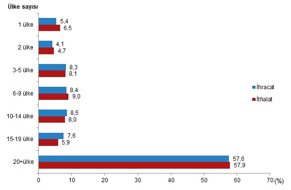 Girişimlerin %37,7'si tek ülkeye ihracat yaparken, %16,2'si iki ülkeye ihracat yaptı. Yirmi ve daha fazla ülkeye ihracat yapan girişimlerin oranı %3,1 iken, bu girişimlerin ihracattaki payı %57,6 oldu.