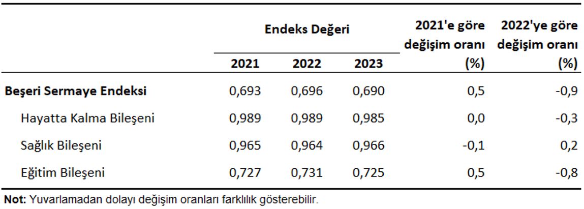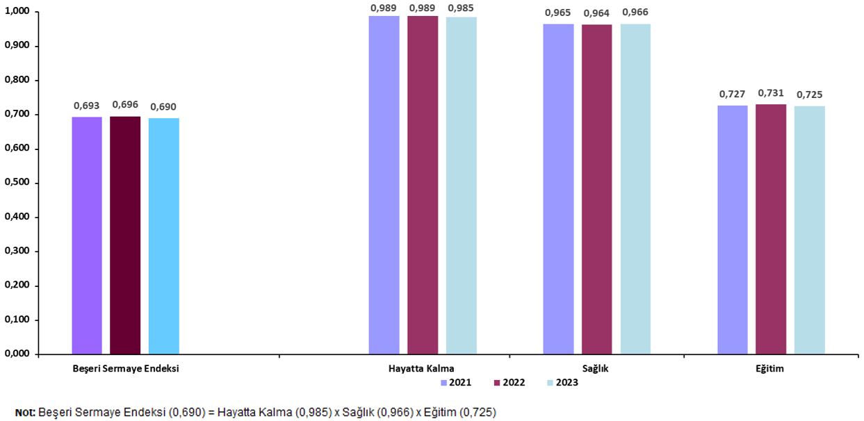 Beşeri sermaye endeksi, 2021 yılında 0,693 iken 2022 yılında 2021'e göre %0,5 artarak 0,696 oldu. 2023 yılında 2022'ye göre %0,9 azalarak 0,690 oldu.