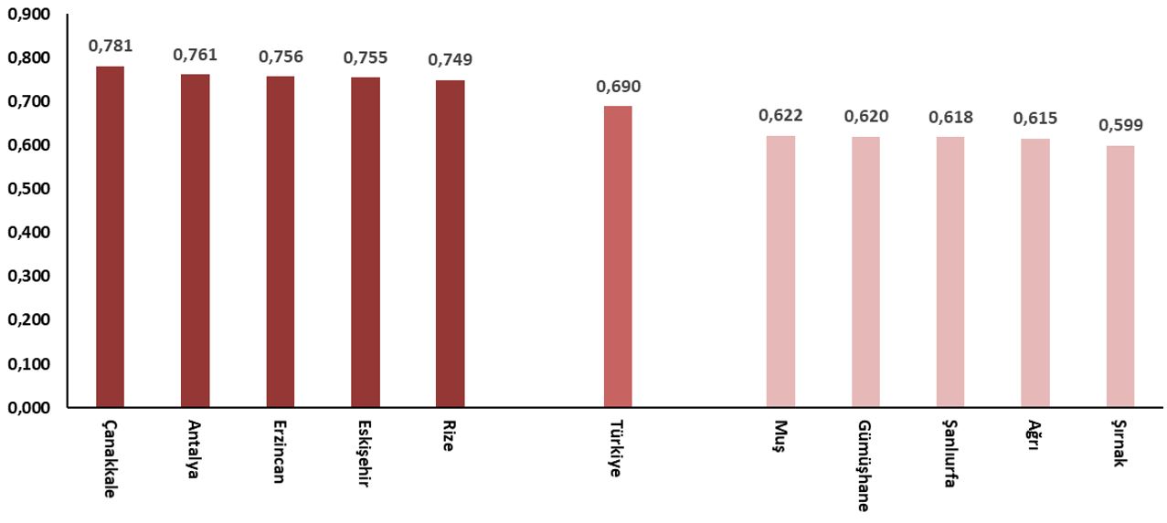 Beşeri sermaye endeksinin en yüksek ve en düşük olduğu 5 il, 2023