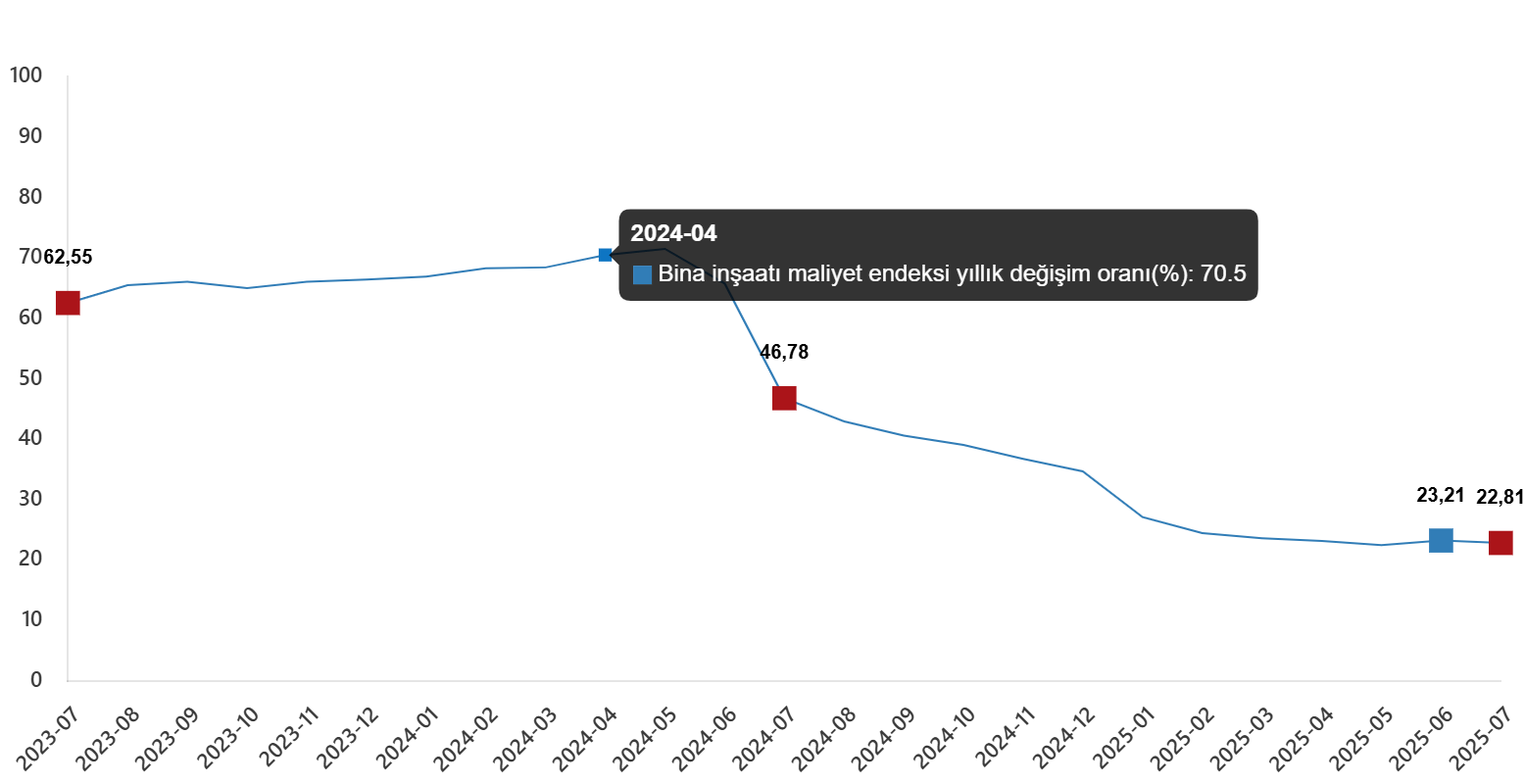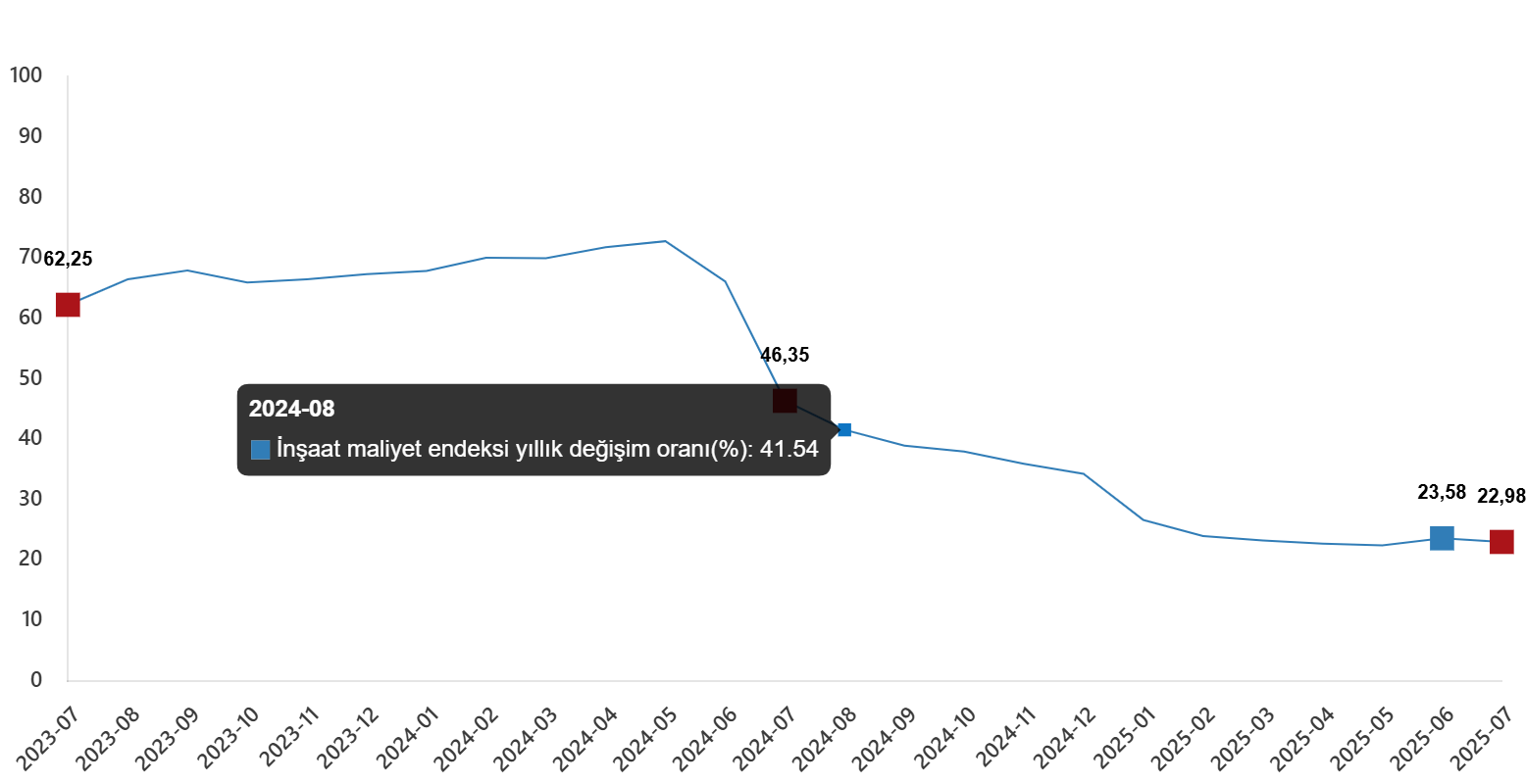 İnşaat maliyet endeksi, 2025 yılı Temmuz ayında bir önceki aya göre %1,41 arttı, bir önceki yılın aynı ayına göre %22,98 arttı. Bir önceki aya göre malzeme endeksi %1,79 arttı, işçilik endeksi %0,72 arttı. Ayrıca bir önceki yılın aynı ayına göre malzeme endeksi %18,98 arttı, işçilik endeksi %31,00 arttı.