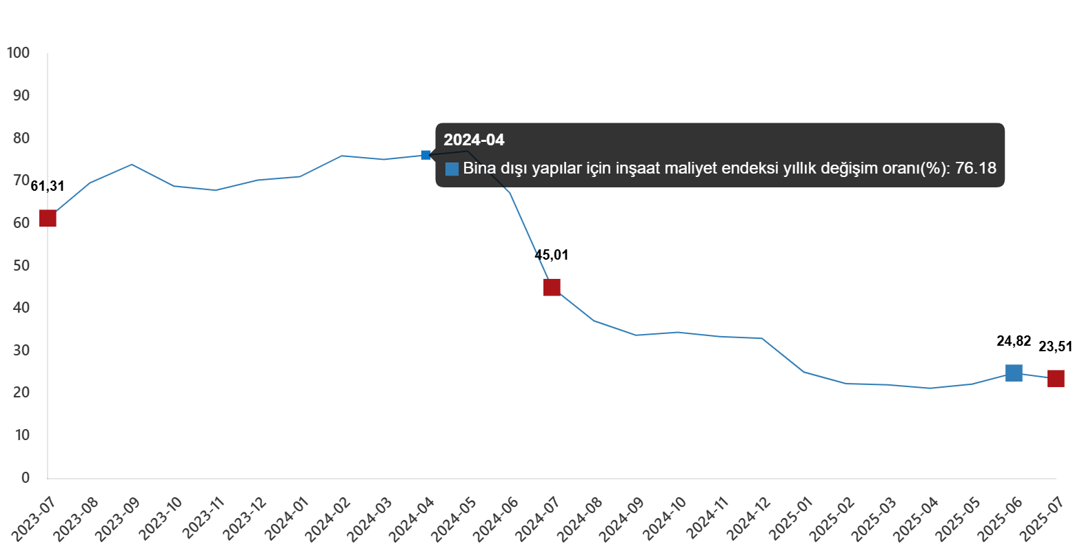 Bina dışı yapılar için inşaat maliyet endeksi yıllık değişim oranı(%), Temmuz 2025