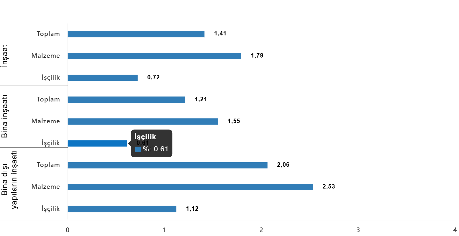 Bina dışı yapılar için inşaat maliyet endeksi, bir önceki aya göre %2,06 arttı, bir önceki yılın aynı ayına göre %23,51 arttı. Bir önceki aya göre malzeme endeksi %2,53 arttı, işçilik endeksi %1,12 arttı. Ayrıca bir önceki yılın aynı ayına göre malzeme endeksi %19,21 arttı, işçilik endeksi %33,32 arttı.