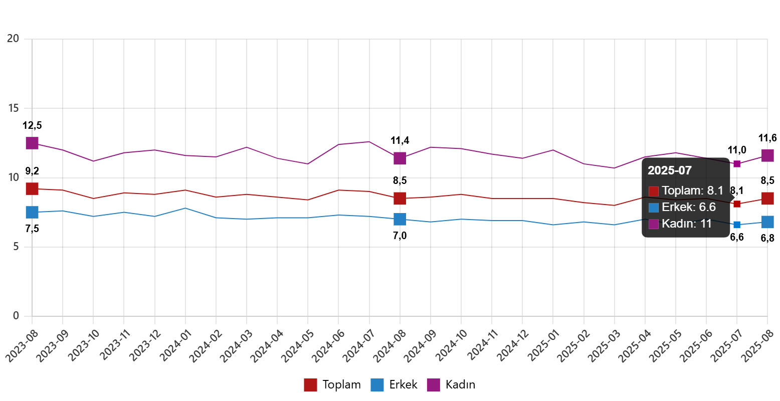 Hanehalkı İşgücü Araştırması sonuçlarına göre; 15 ve daha yukarı yaştaki kişilerde işsiz sayısı 2025 yılı Ağustos ayında bir önceki aya göre 168 bin kişi artarak 3 milyon 44 bin kişi oldu. İşsizlik oranı ise 0,4 puan artarak %8,5 seviyesinde gerçekleşti. İşsizlik oranı erkeklerde %6,8 iken kadınlarda %11,6 olarak tahmin edildi.
