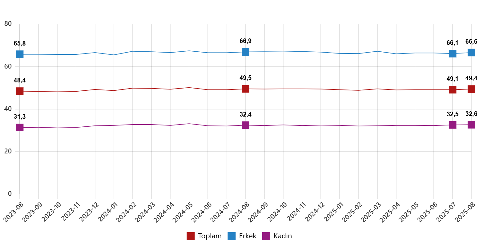 İstihdam edilenlerin sayısı 2025 yılı Ağustos ayında bir önceki aya göre 208 bin kişi artarak 32 milyon 829 bin kişi, istihdam oranı ise 0,3 puan artarak %49,4 oldu. Bu oran erkeklerde %66,6 iken kadınlarda %32,6 olarak gerçekleşti.