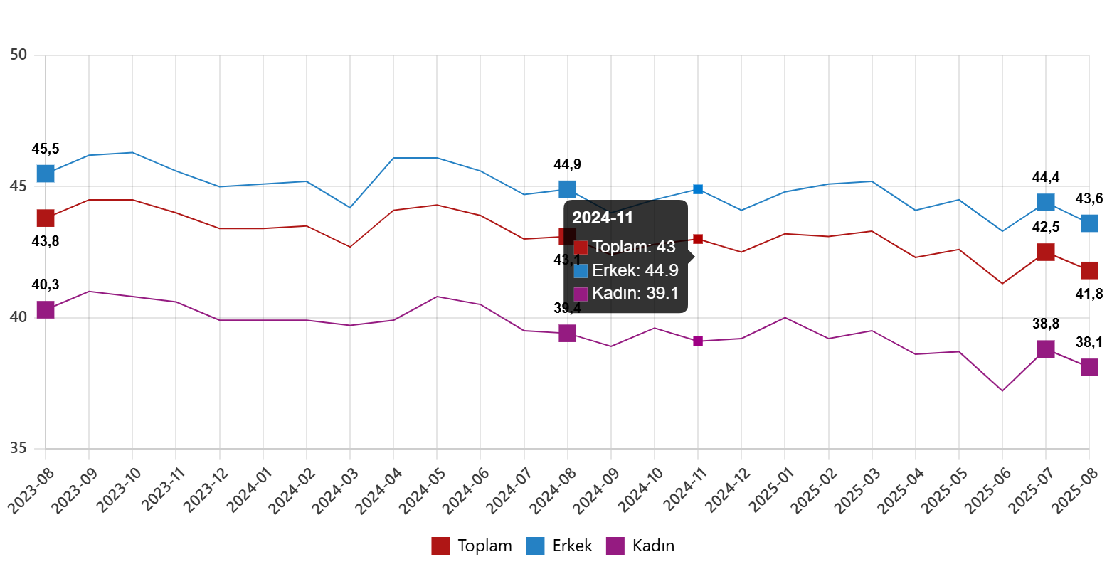 İstihdam edilenlerden referans döneminde işbaşında olanların, mevsim ve takvim etkilerinden arındırılmış haftalık ortalama fiili çalışma süresi 2025 yılı Ağustos ayında bir önceki aya göre 0,7 saat azalarak 41,8 saat olarak gerçekleşti.