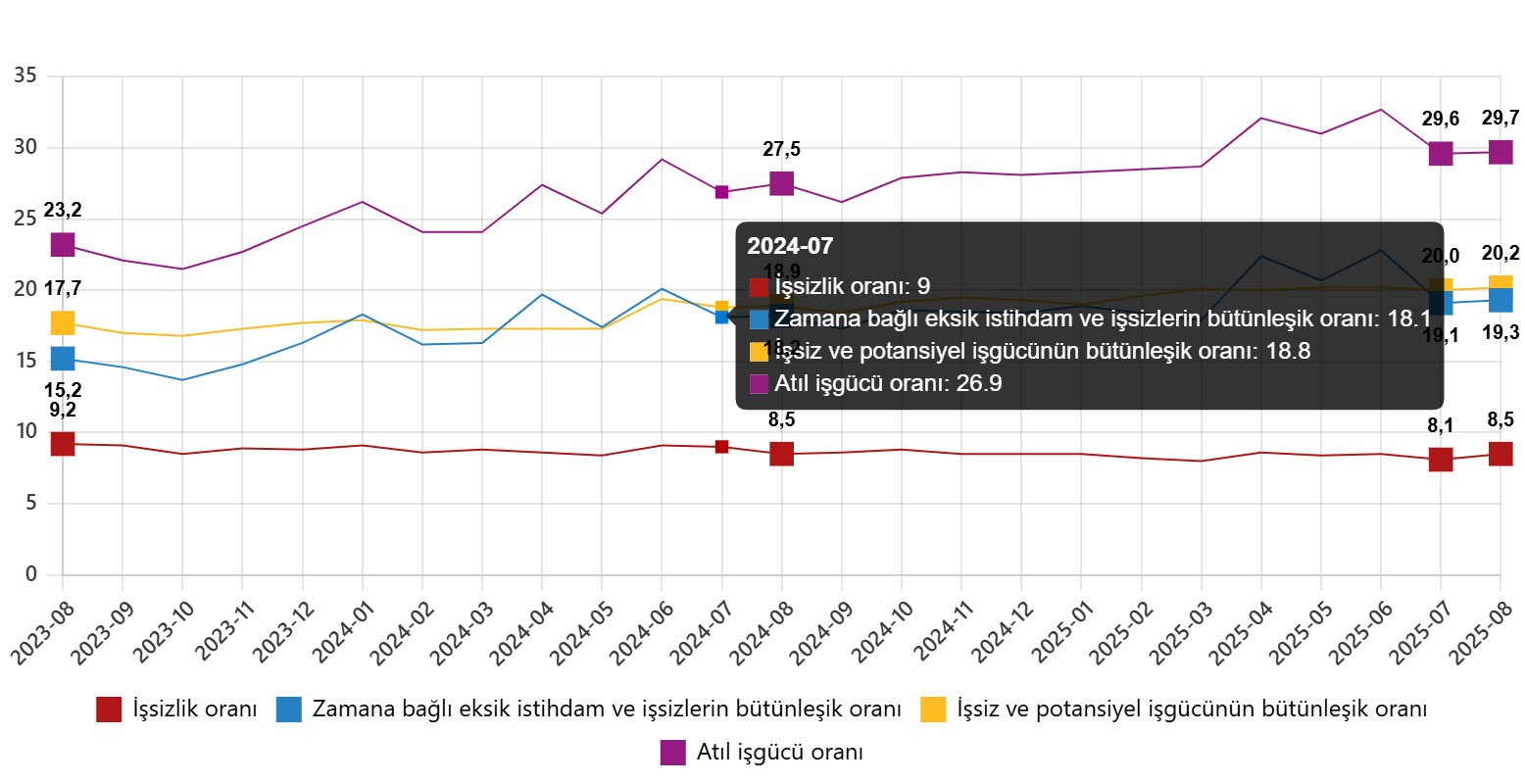 Zamana bağlı eksik istihdam, potansiyel işgücü ve işsizlerden oluşan atıl işgücü oranı 2025 yılı Ağustos ayında bir önceki aya göre 0,1 puan artarak %29,7 oldu. Zamana bağlı eksik istihdam ve işsizlerin bütünleşik oranı %19,3 iken işsiz ve potansiyel işgücünün bütünleşik oranı %20,2 olarak tahmin edildi.