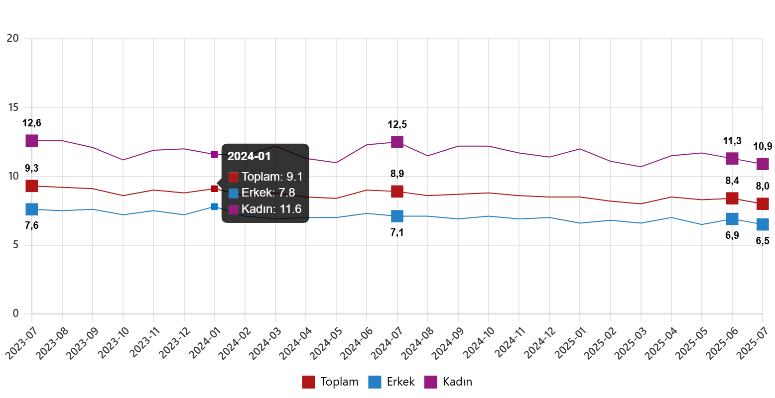 Hanehalkı İşgücü Araştırması sonuçlarına göre; 15 ve daha yukarı yaştaki kişilerde işsiz sayısı 2025 yılı Temmuz ayında bir önceki aya göre 164 bin kişi azalarak 2 milyon 828 bin kişi oldu. İşsizlik oranı ise 0,4 puan azalarak %8,0 seviyesinde gerçekleşti. İşsizlik oranı erkeklerde %6,5 iken kadınlarda %10,9 olarak tahmin edildi.