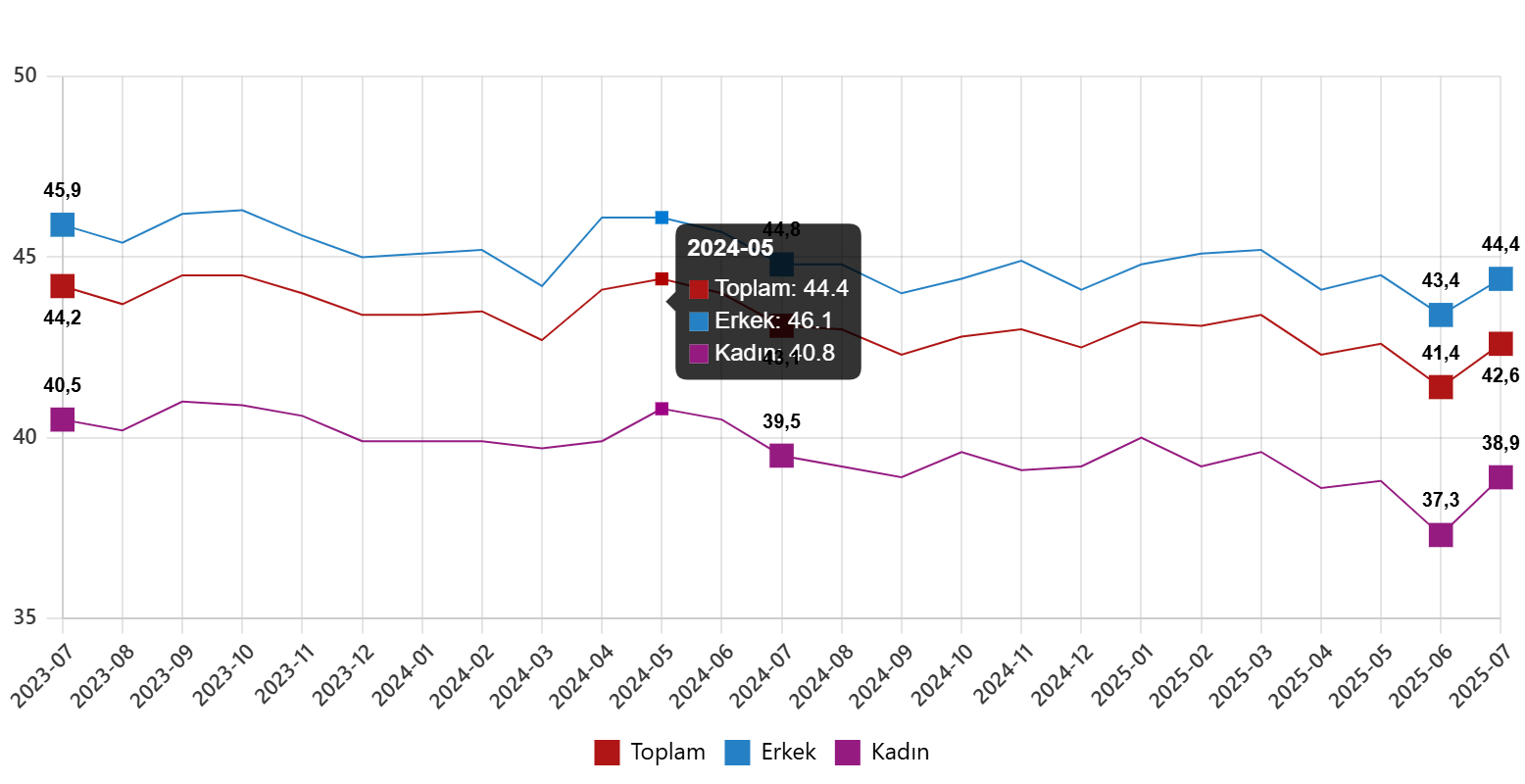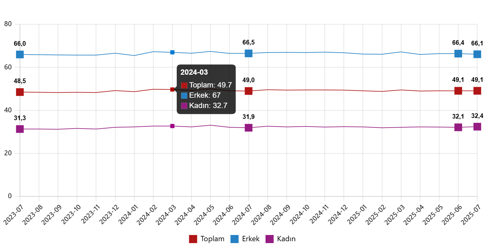 İşgücü, 2025 yılı Temmuz ayında bir önceki aya göre 146 bin kişi azalarak 35 milyon 410 bin kişi, işgücüne katılma oranı ise 0,3 puan azalarak %53,3 olarak gerçekleşti. İşgücüne katılma oranı erkeklerde %70,6 iken kadınlarda %36,4 oldu.