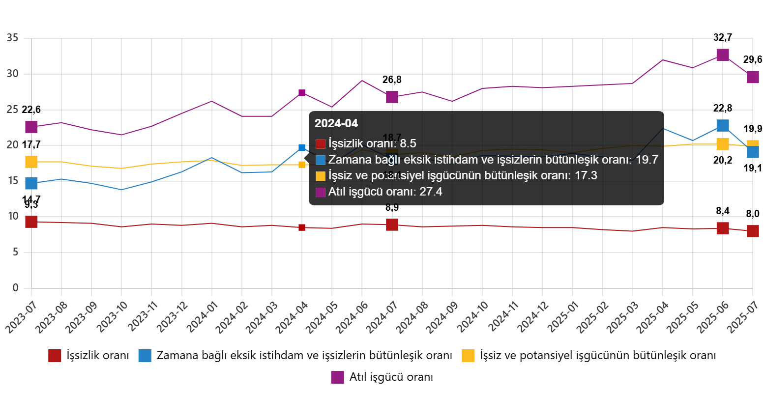 Zamana bağlı eksik istihdam, potansiyel işgücü ve işsizlerden oluşan atıl işgücü oranı 2025 yılı Temmuz ayında bir önceki aya göre 3,1 puan azalarak %29,6 oldu. Zamana bağlı eksik istihdam ve işsizlerin bütünleşik oranı %19,1 iken işsiz ve potansiyel işgücünün bütünleşik oranı %19,9 olarak tahmin edildi.