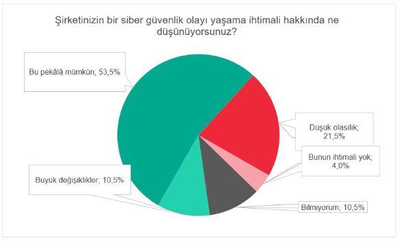 Anket, katılımcıların çoğunluğunun siber güvenliğin BT departmanı tarafından dikkate alınması gereken bir konu olduğunu anladığını gösterirken, Türkiye’deki katılımcıların %22,5’i üst düzey yöneticileri, %22’si hukuk ve finans çalışanlarını siber güvenlik konularına dikkat etmesi gereken işletme içindeki temel gruplar olarak belirtiyor. Ankete katılan çalışanların yalnızca %26,3’ü siber güvenliği işletme genelinde tüm çalışanlar tarafından dikkate alınması gereken bir konu olarak görüyor.