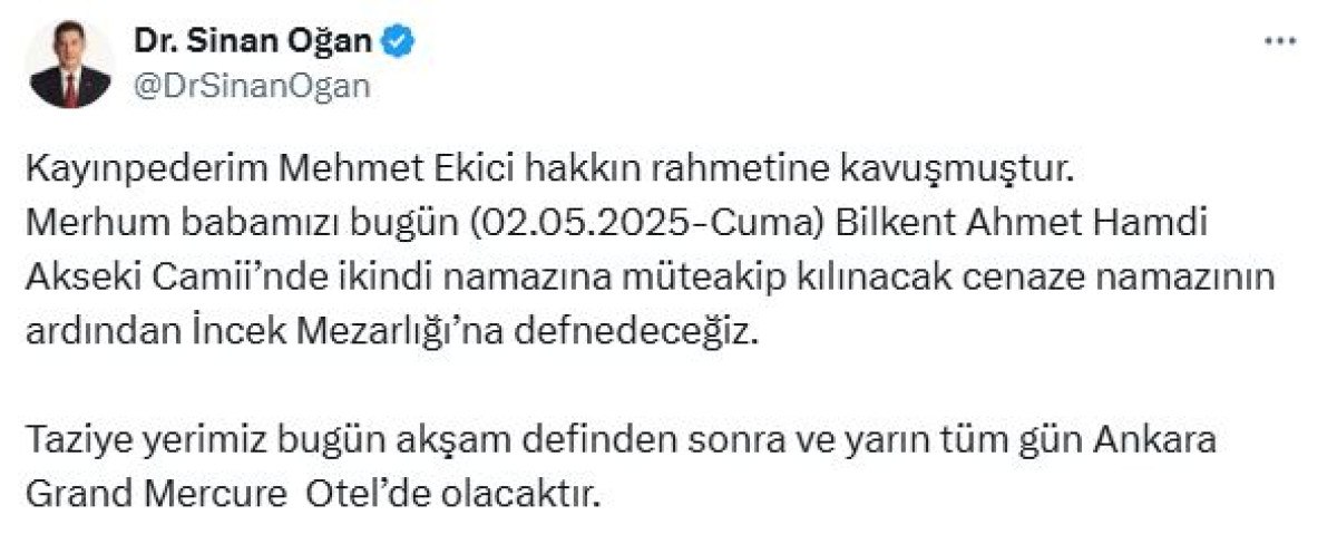 Vefat haberini duyuran isim, eski Cumhurbaşkanı adayı Sinan Oğan oldu. Oğan sosyal medya üzerinden yaptığı paylaşımda şunları belirtti: