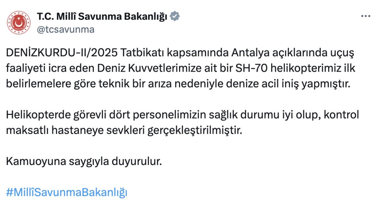 DENİZKURDU-II/2025 Tatbikatı kapsamında Antalya açıklarında görev yapan Deniz Kuvvetlerimize ait bir SH-70 helikopterin, ilk belirlemelere göre teknik bir arızadan dolayı denize acil iniş yapmak zorunda kaldığı bildirildi. Helikopterde bulunan dört personelin sağlık durumu iyi olup, kontrol amaçlı hastaneye sevk edildi. Kamuoyuna duyurulur.