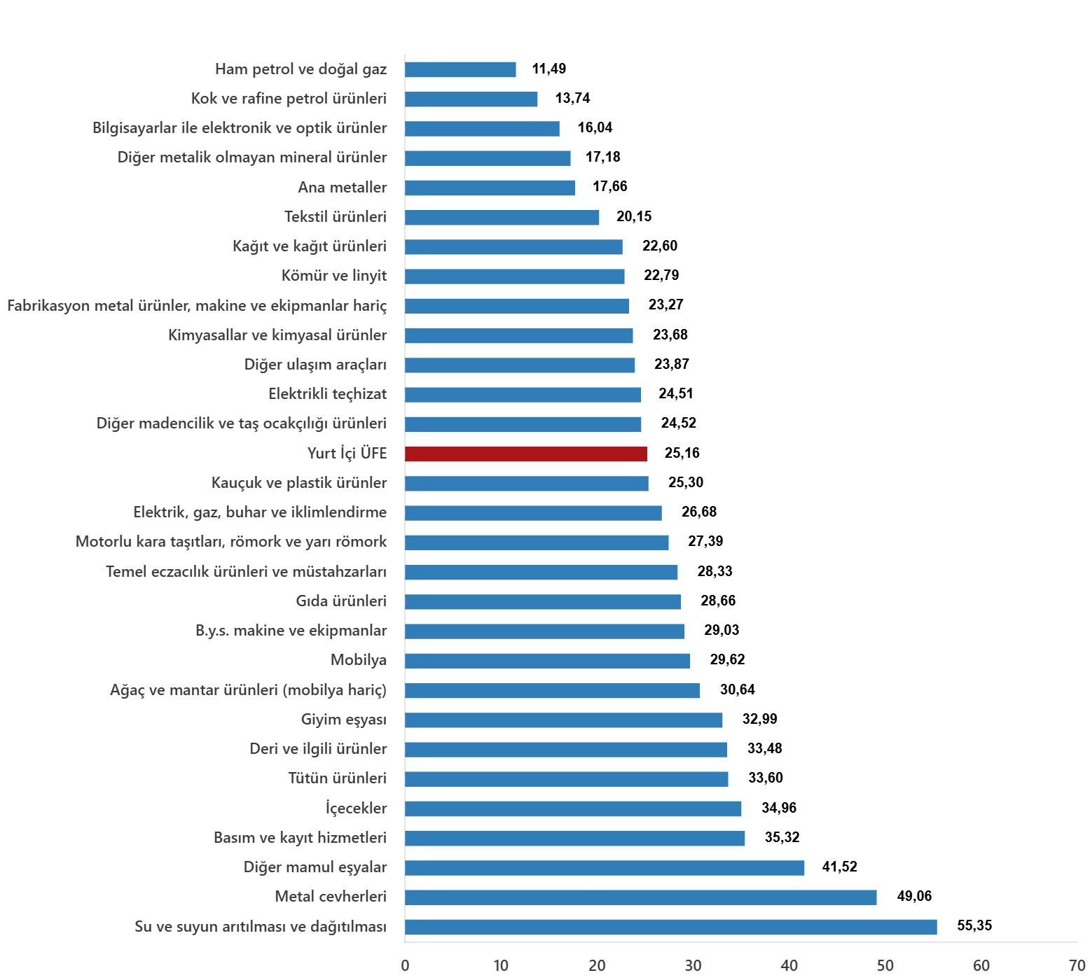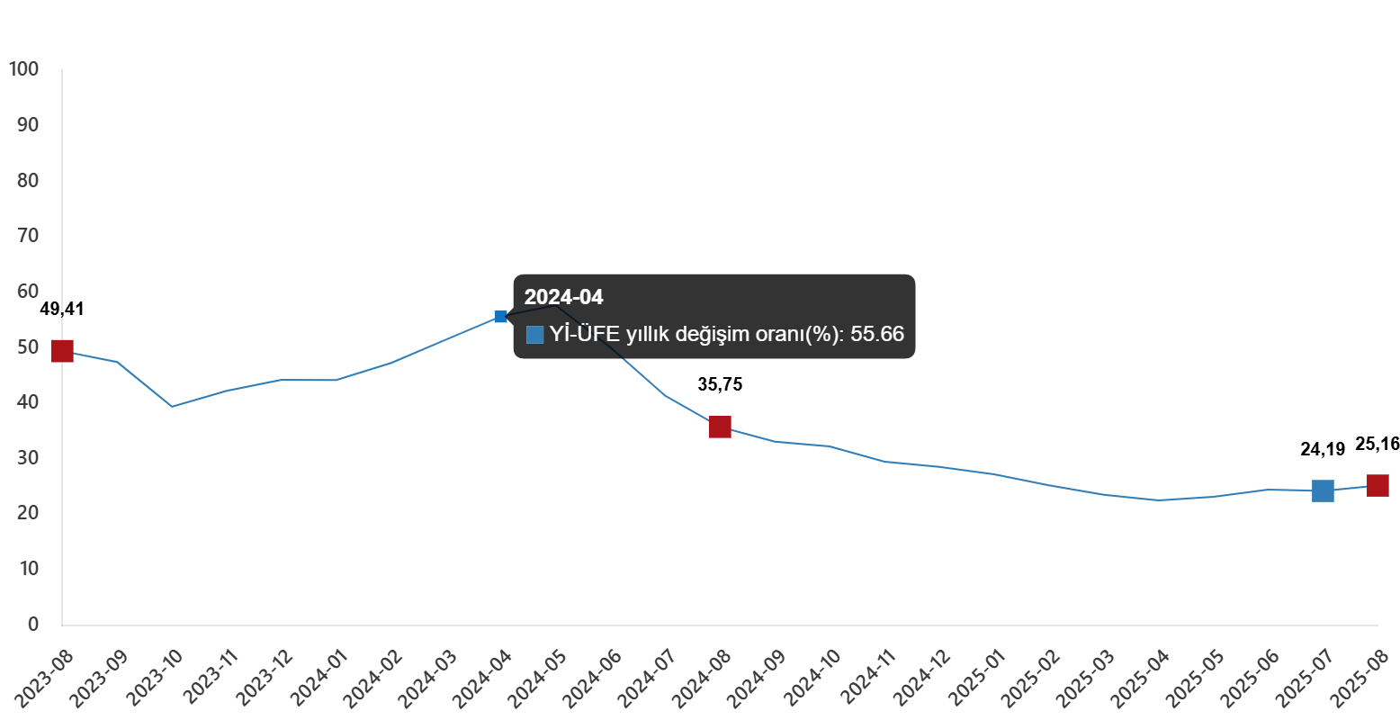 Yİ-ÜFE (2003=100) 2025 yılı Ağustos ayında bir önceki aya göre %2,48 artış, bir önceki yılın Aralık ayına göre %20,62 artış, bir önceki yılın aynı ayına göre %25,16 artış ve on iki aylık ortalamalara göre %26,28 artış gösterdi.