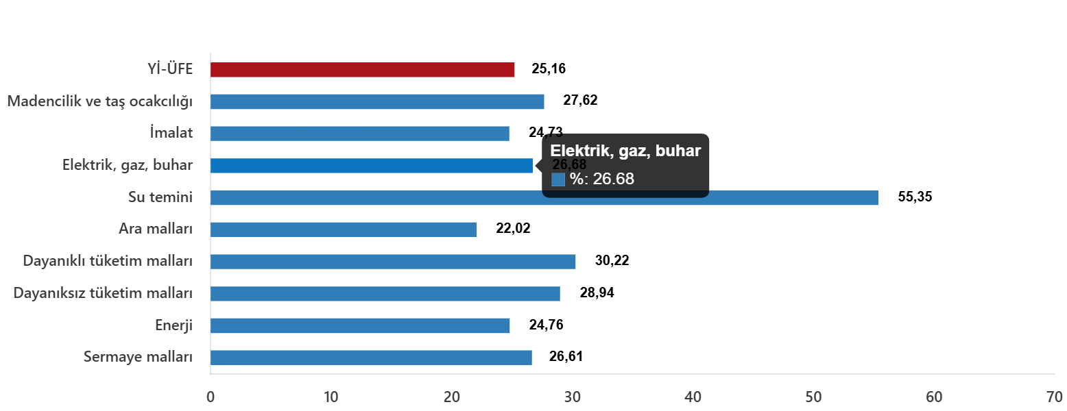Ana sanayi gruplarının yıllık değişimleri; ara mallarında %22,02 artış, dayanıklı tüketim mallarında %30,22 artış, dayanıksız tüketim mallarında %28,94 artış, enerjide %24,76 artış ve sermaye mallarında %26,61 artış olarak gerçekleşti.